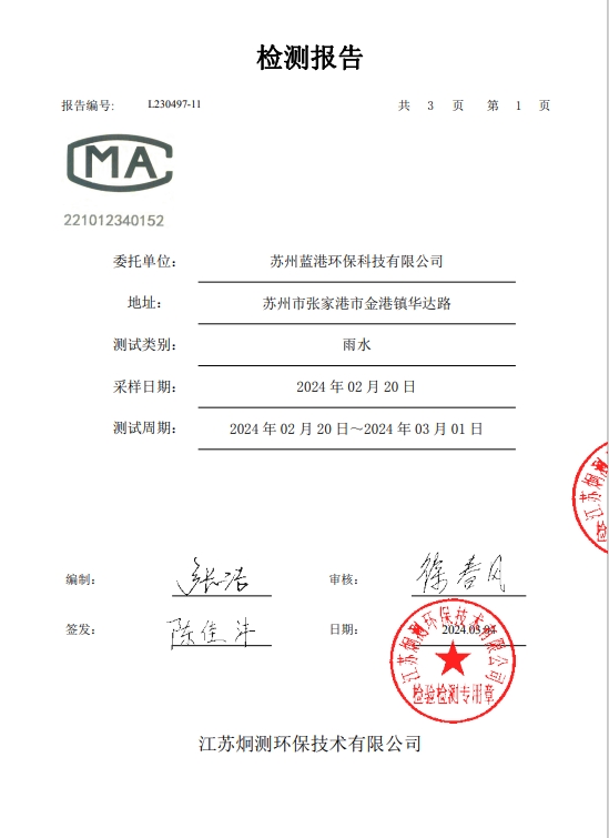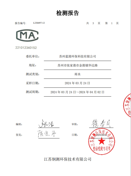 蘇州藍(lán)港環(huán)保科技有限公司檢測報告已公示,詳情請查...